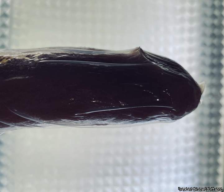 Almost fully hard, wrapped tightly by a condom, showing the big mushroom head