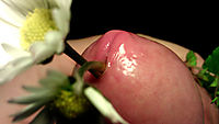 Hard with foreskin covering the head