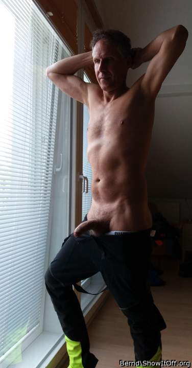 Love pulling my uncut cock and balls out of my pants to start stroking.