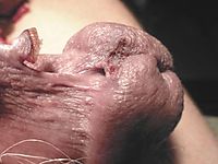 Flaccid penis with nude glans, corona and frenulum