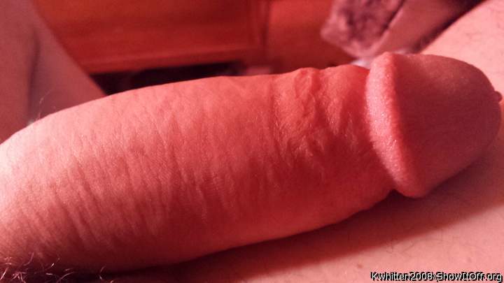 Almost fully hard, wrapped tightly by a condom, showing the big mushroom head